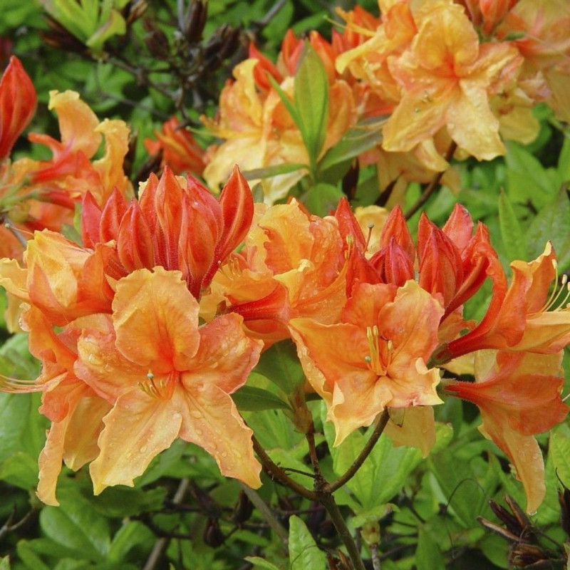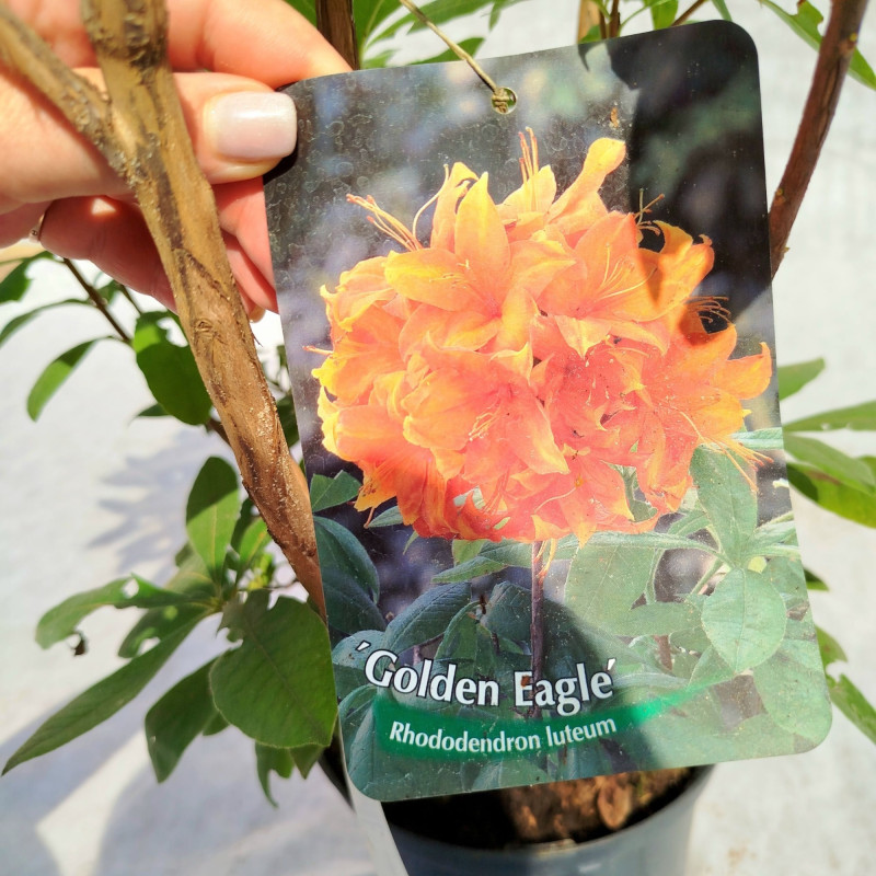 Азалія Кнапп-Хілл Голден Ігл (Rhododendron Knapp-Hill Golden Eagle) – надзвичайно декоративний сорт листопадної азалії, який вражає своїм яскравим, теплим забарвленням. У період цвітіння кущ перетворюється на полум’яне видовище завдяки великим квітам насиченого помаранчево-золотавого кольору з м’яким червонуватим відтінком у центрі. Ця азалія належить до групи Кнапп-Хілл, що відома своєю зимостійкістю, рясним цвітінням і стійкістю до несприятливих умов. Рослина зберігає декоративність протягом усього сезону – після цвітіння її густе зелене листя створює приємний фон у садових композиціях.