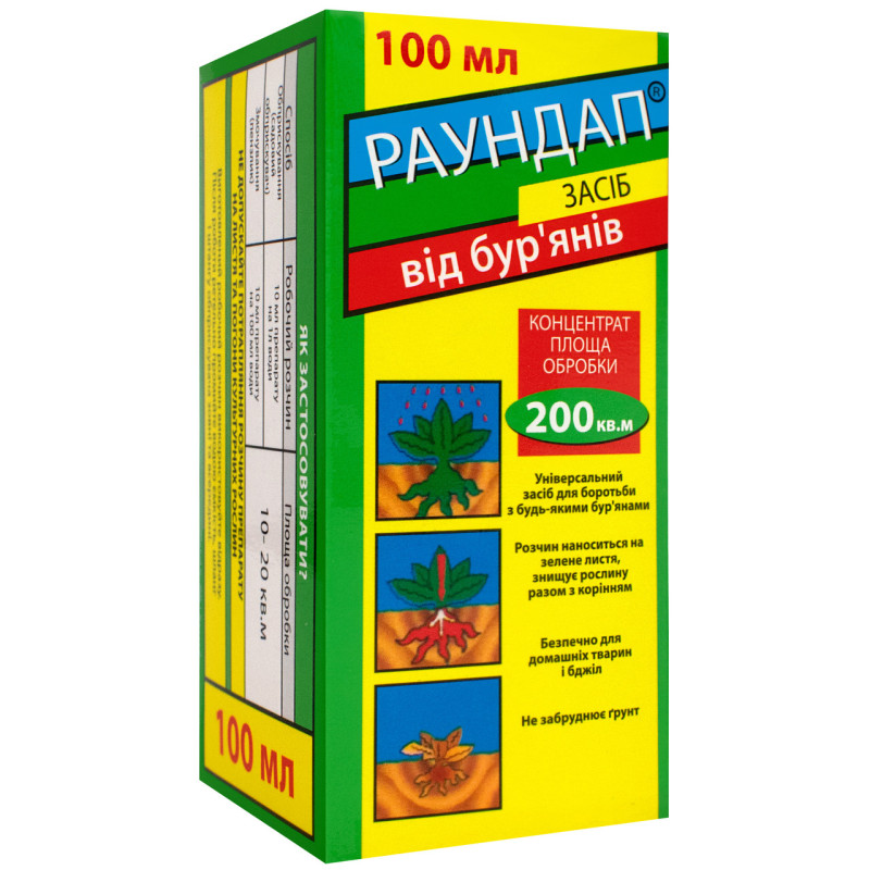 Гербіцид Раундап (гліфосату калійна сіль, 550 г/л) Р.К. 100 мл, Монсанто - Байер – системний гербіцид суцільної дії, призначений для боротьби з однодольними та дводольними бур'янами. Головний активний компонент цього гербіциду – гліфосат, який проникає в бур'яни через листя та інші зелені частини, блокуючи синтез ароматичних амінокислот. Це призводить до ураження точок росту та до повного відмирання надземних та підземних органів шкідливих рослин.