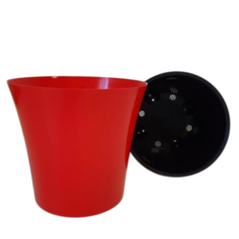 Модель виконана у яскравому червоному кольорі з контрастною чорною вставкою, що робить вазон виразним елементом інтер’єру. Такий горщик здатний стати стильним акцентом у приміщенні, підкреслюючи красу кімнатних квітів і одночасно додаючи простору енергійності та яскравості.