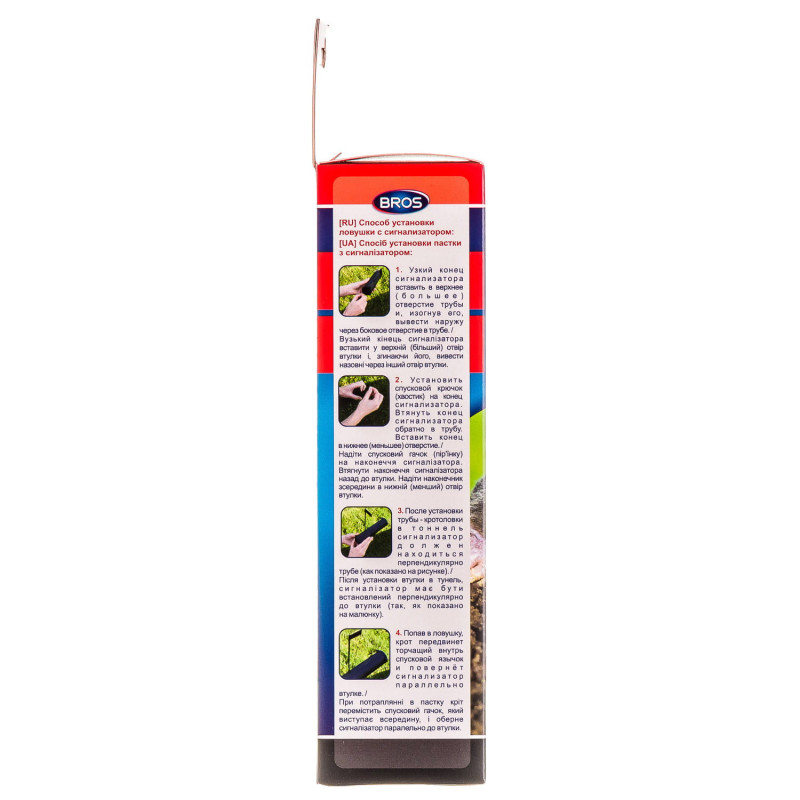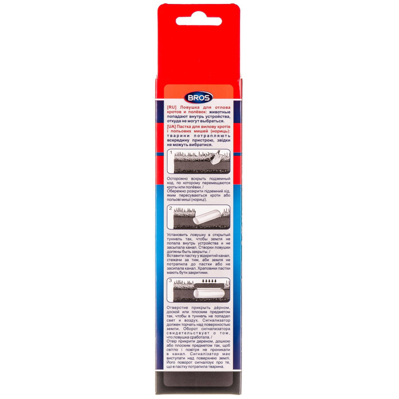 Пастка Bros встановлюється безпосередньо в підземний хід між кротовинами, де шкідник найчастіше пересувається. Коли тварина потрапляє всередину, механізм миттєво спрацьовує, перекриваючи вихід. Про результат роботи повідомляє спеціальний прапорець, який змінює своє положення над поверхнею ґрунту, дозволяючи легко перевіряти пастку без зайвого втручання.
