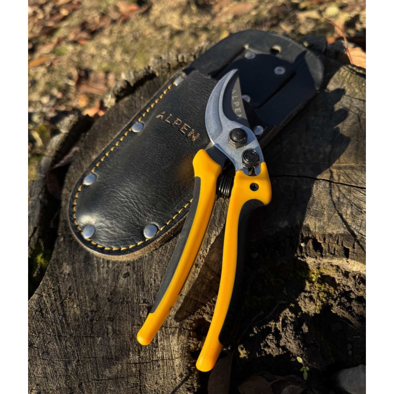 Шкіряна кобура Альпен Тамбо 990 створена для комфортного носіння секатора на поясі та забезпечення максимальної мобільності під час роботи. Натуральна чорна шкіра, акуратна жовта строчка й лазерне гравіювання логотипу Alpen підкреслюють преміальний стиль виробу.