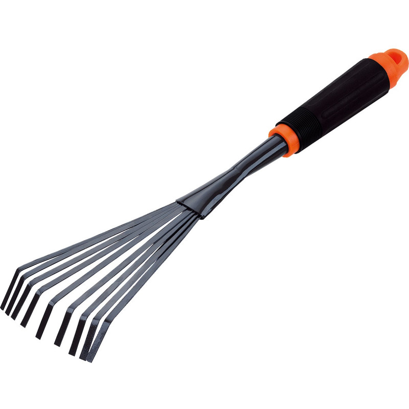 Маневрений інструмент із дев’ятьма круглими зубцями призначений для прибирання опалого листя, трави та дрібного сміття між рослинами. Високоякісна сталь із захисним покриттям гарантує довгий термін служби, а пластикова ручка підвищує комфорт роботи. Загальна довжина грабельок становить 39 см, що дозволяє ефективно працювати на клумбах, у садах та теплицях.