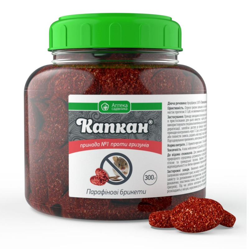 Родентицид Капкан – ефективна готова приманка у формі парафінових брикетів, створена для швидкого та надійного знищення мишоподібних гризунів: щурів, хатніх мишей, полівок і пацюків. Препарат придатний для використання як у приміщеннях, так і на відкритих територіях.
