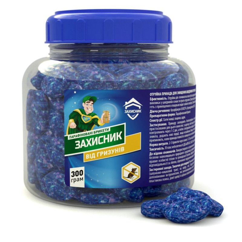 Родентицид Захисник у формі парафінових брикетів – це готовий до використання засіб для ефективної боротьби з мишами, щурами та іншими гризунами. Завдяки продуманій формулі він підходить для застосування як у житлових і господарських приміщеннях, так і на відкритих територіях – у підвалах, коморах, на горищах чи присадибних ділянках.