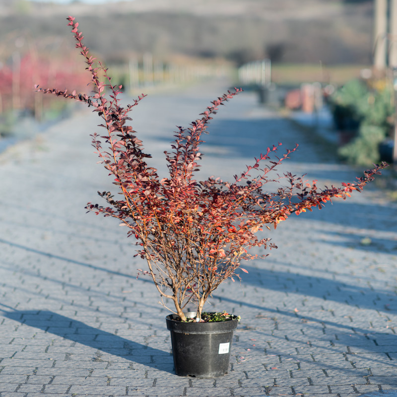 Крона барбариса представляет собой основные вертикальные побеги, а также боковые веточки, бордового цвета, на которых присутствуют шипы кремового цвета. Листочки насыщенные красные, и осенью меняют свой цвет, приобретая оранжево-багровый окрас. После того, как листья опадают, на растении появляются светло-красные ягодки, которые собраны в кисти. Кстати, ягодки данного сорта съедобные.