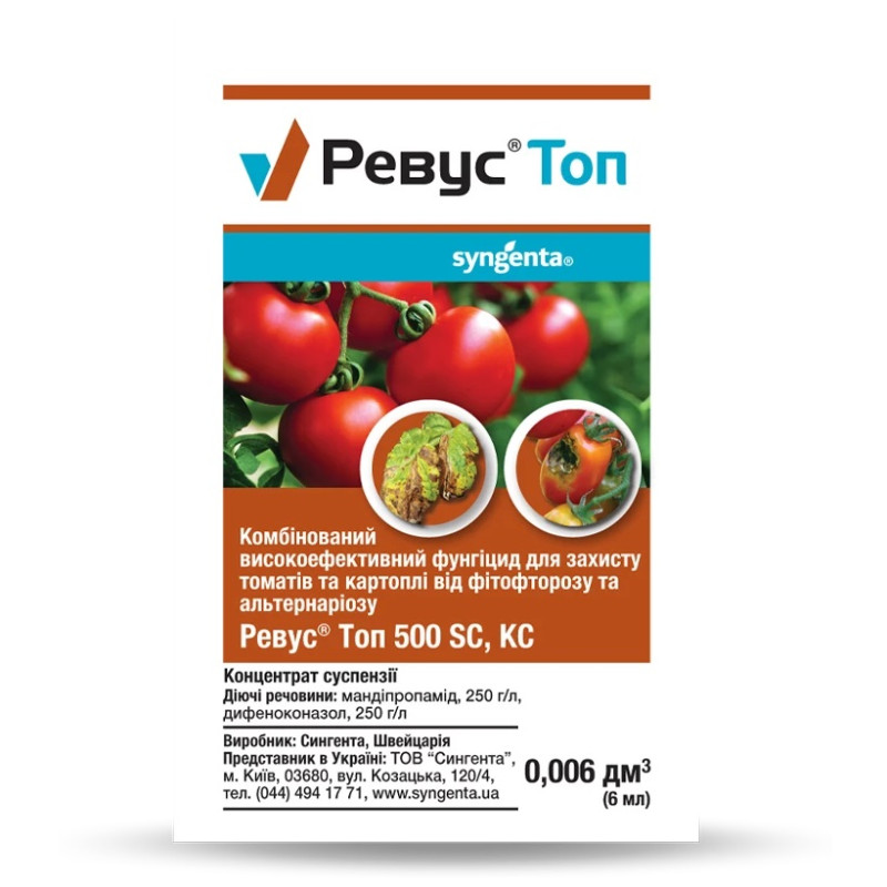Фунгицид Ревус Топ 500 SC л.с 6 мл – новый препарат известного швейцарского бренда Syngenta, предназначенный для защиты томатов, картофеля и других культур от основных болезней. Содержит два действующих вещества – мандипропамид и дифеноконазол. Помимо действия на альтернариоз и фитофтороз, препарат Ревус Топ 500 SC, л. оказывает сильное дополнительное действие на ризоктониоз, септориоз и другие болезни.