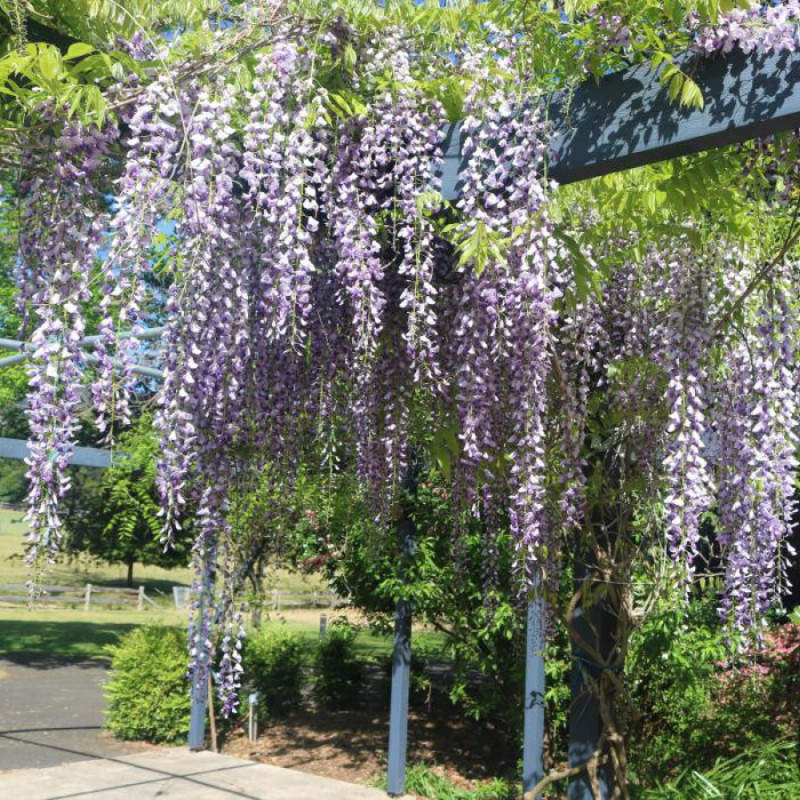 Глициния обильноцветущая Перпл Патчес (Wisteria floribunda Purple Patches) – роскошная цветущая лиана, поражающая своим эффектным фиолетово-лиловым цветением и изящной декоративностью. Она формирует длинные свисающие кисти ароматных цветов, которые придают саду волшебный, почти сказочный вид. Этот сорт сочетает элегантность и выносливость, отлично растет на солнечных местах, хорошо переносит городские условия и быстро наращивает зеленую массу, образуя густое озеленение.