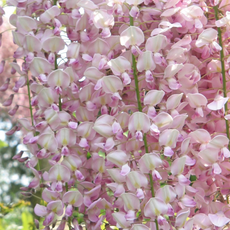 Глициния обильноцветущая Pink Ice представляет собой густо облиственную лиану с длинными спадающими вниз соцветиями-кистями: