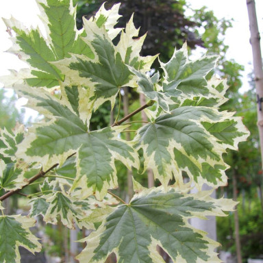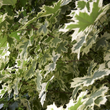 Клен остролистный Drumondii прекрасен с ранней весны до поздней осени. Молодая листва и побеги окрашены в нежные розовые тона, летом листья приобретают вариегатную желто-зеленую окраску, с приходом сентября становятся ярко-желтыми.
