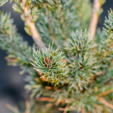 • Густая сине-зеленая хвоя с сизым оттенком длиной 3 см собрана в пучки по 5 шт., слегка закручивается на концах.