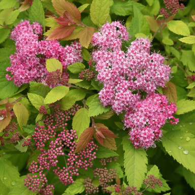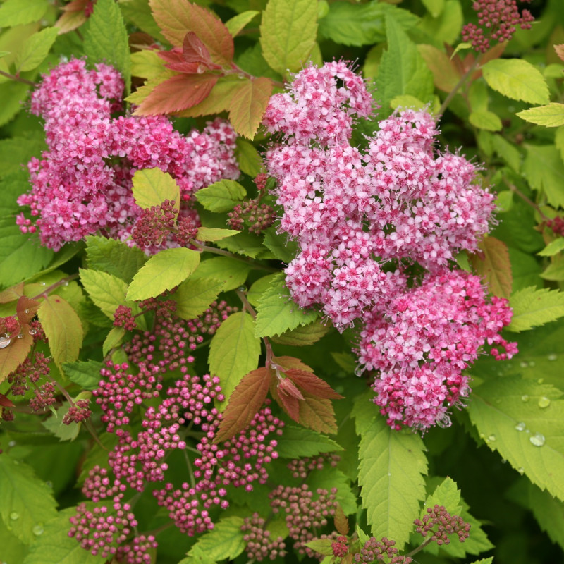 Весной спирея отличается насыщенной оранжево-красной окраской молодых листьев, которая со временем переходит в теплые золотисто-зеленые тона, а осенью снова вспыхивает яркими оранжево-красными красками. В период цветения, который длится с июня по август, куст покрывается множеством мелких розово-пурпурных цветов, собранных в плотные щитковидные соцветия. Такое изменение цветов делает растение декоративным в течение всего сезона.