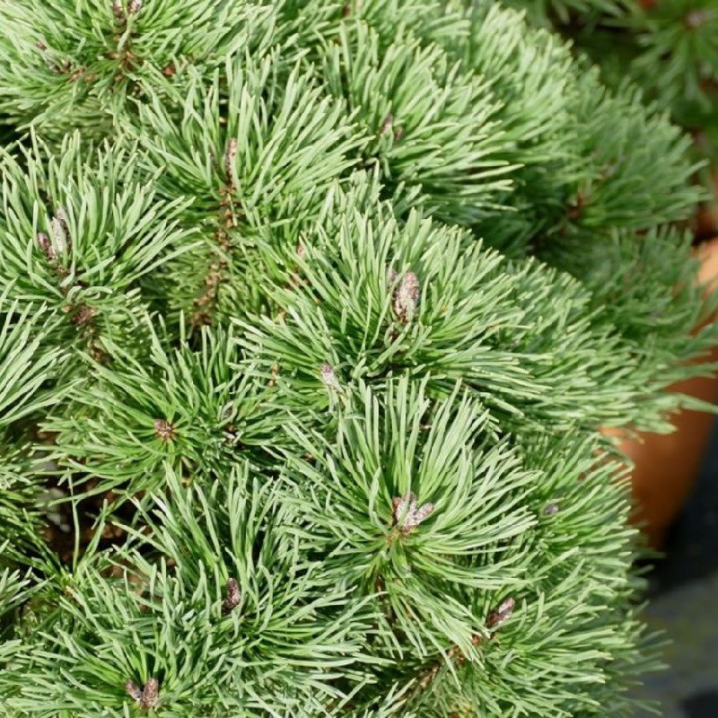Серед головних переваг сосни Nana – висока морозостійкість, стійкість до міських умов і невибагливість до ґрунтів. Її темно-зелена хвоя злегка блискуча, утворює густі подушки, що робить рослину надзвичайно декоративною протягом усього року.