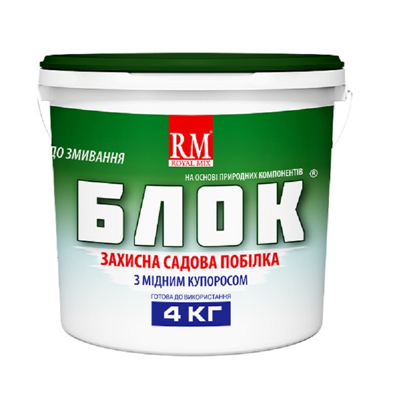 Захисна фарба для дерев та кущів з мідним купоросом БЛОК 4 кг – це готовий засіб для побілки стовбурів і скелетних гілок плодових, декоративних та ягідних рослин. Садова побілка призначена для комплексного захисту кори від шкідників, грибкових і бактеріальних уражень, а також для профілактики сонячних опіків і підвищення зимостійкості дерев.